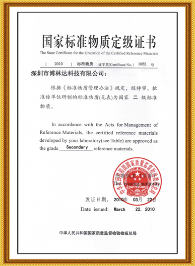國(guó)家標(biāo)準(zhǔn)物質(zhì)定級(jí)證書(2010年)