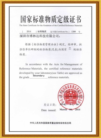 國(guó)家標(biāo)準(zhǔn)物質(zhì)定級(jí)證書(2014年)